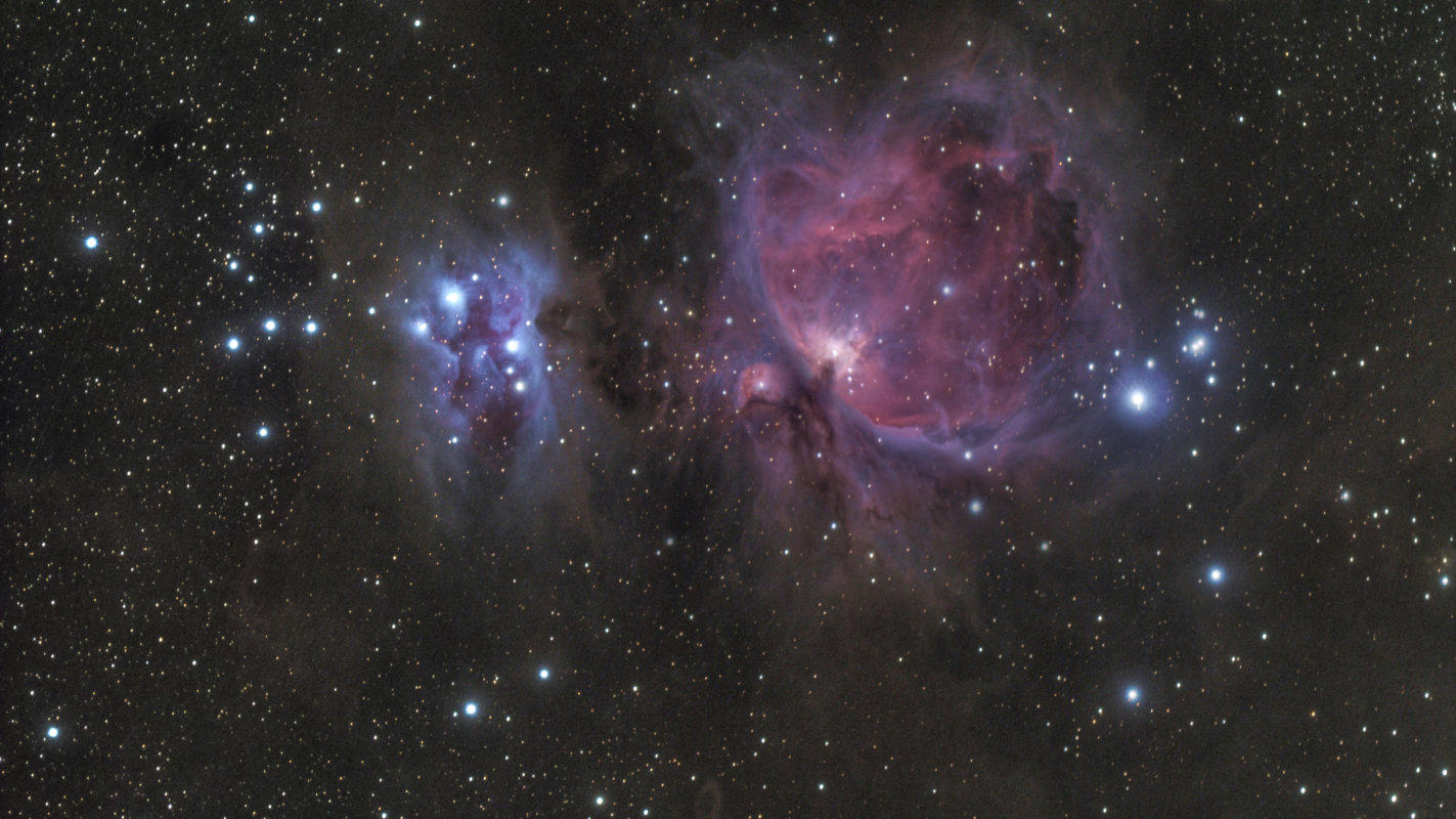 Der Orionnebel ist ein Emissionsnebel und besteht aus den Einzelobjekten M 42 (im Süden)